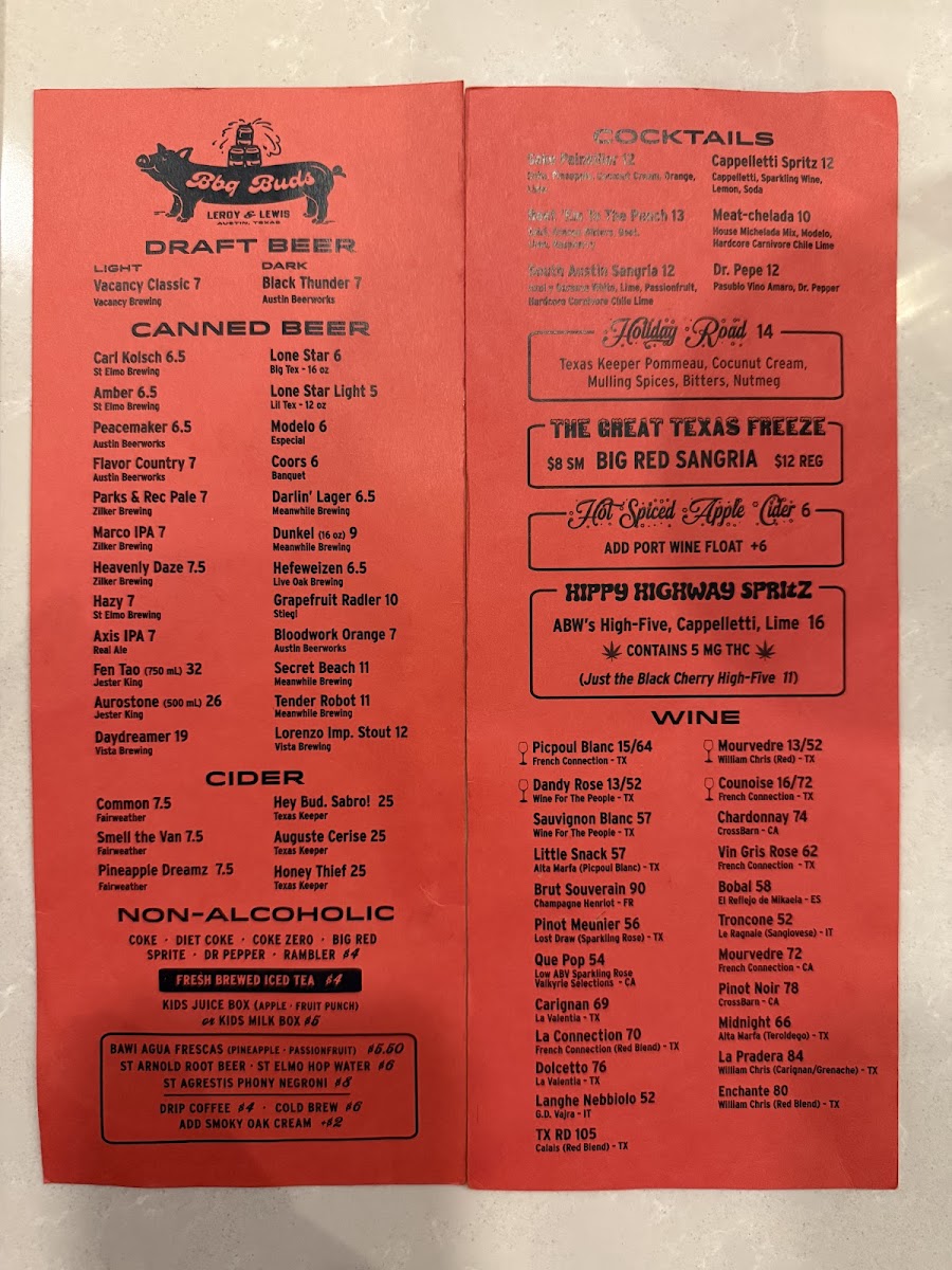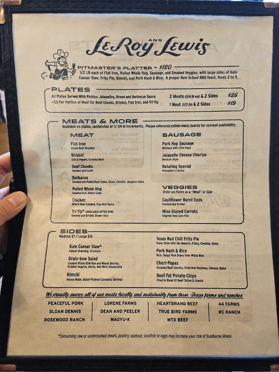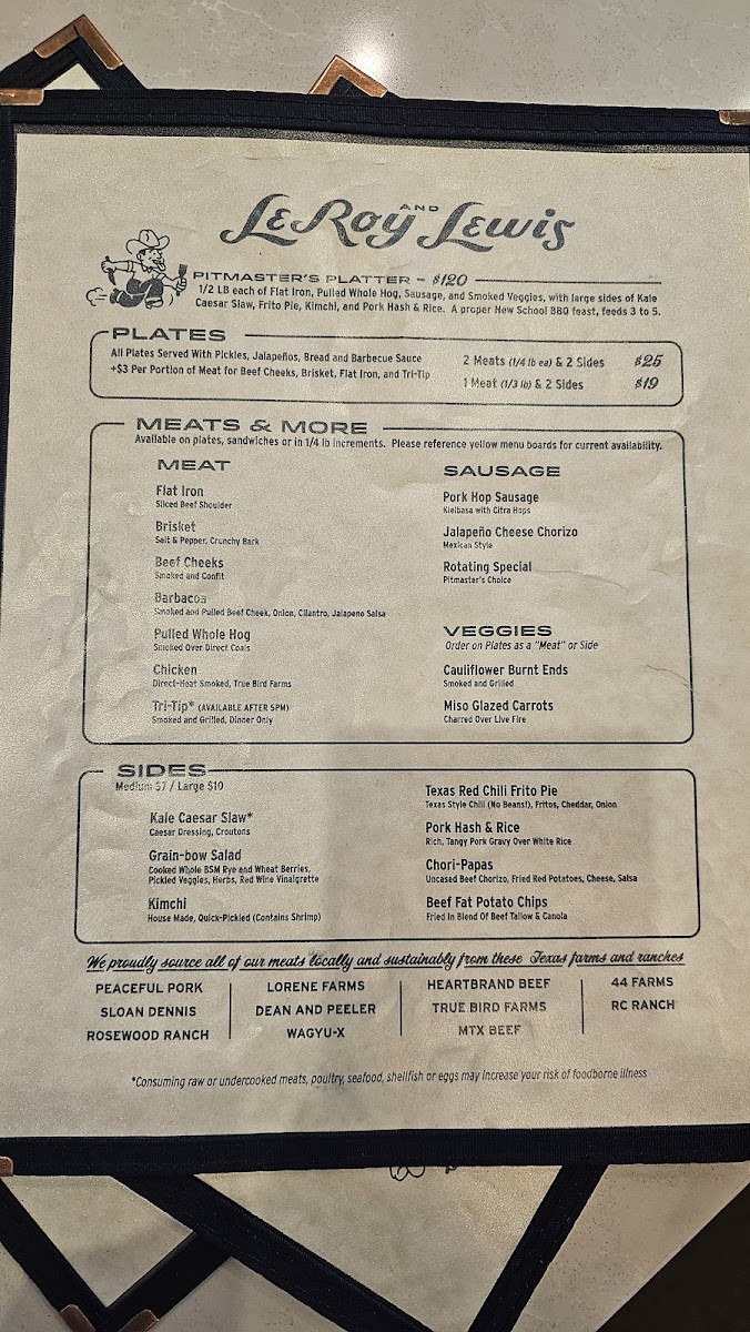 Leroy and Lewis Barbecue in Austin, TX, offers a refined take on classic barbecue with a focus on premium meats and unique flavors. Highlights include the tender 44 Farms Beef Cheeks and the smoky Akaushi Brisket, both celebrated for their rich depth and melt-in-your-mouth texture. The Pulled Whole Hog and house-made Citra Hop Pork Sausage bring robust, balanced flavors. Vegan diners will appreciate the innovative Cauliflower Burnt Ends, a bold plant-based option.