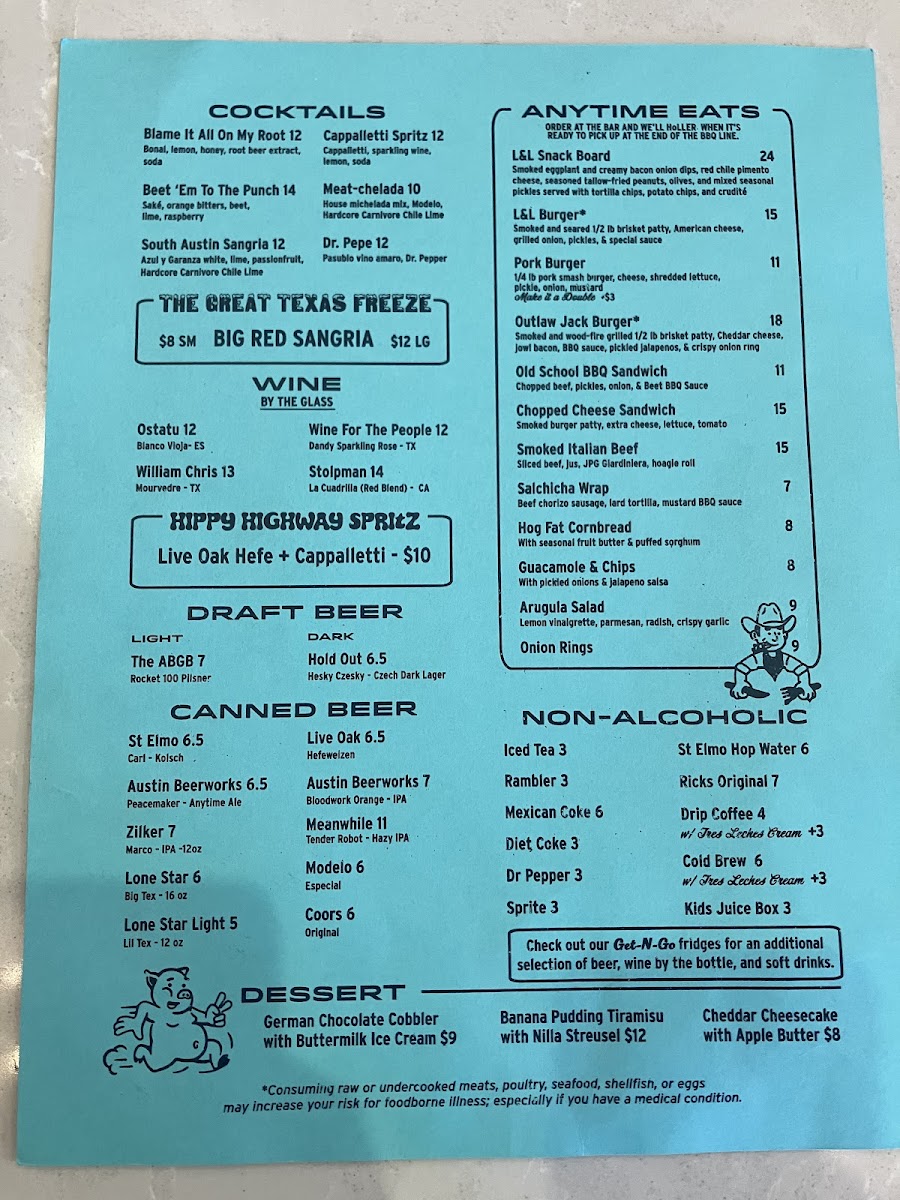 The L&L Burger, featuring a smoked brisket patty, cheese, and grilled onions on a toasted potato bun, stands out as a must-try entree for its juicy, smoky character. The Barbacado, with barbacoa atop half an avocado and accented by queso fresco and jalapeño salsa, offers a fresh contrast to the smoky meats. For a comforting finish, the Cheddar Cheesecake with Ritz crust and apple butter blends savory and sweet in a surprising, delightful dessert.